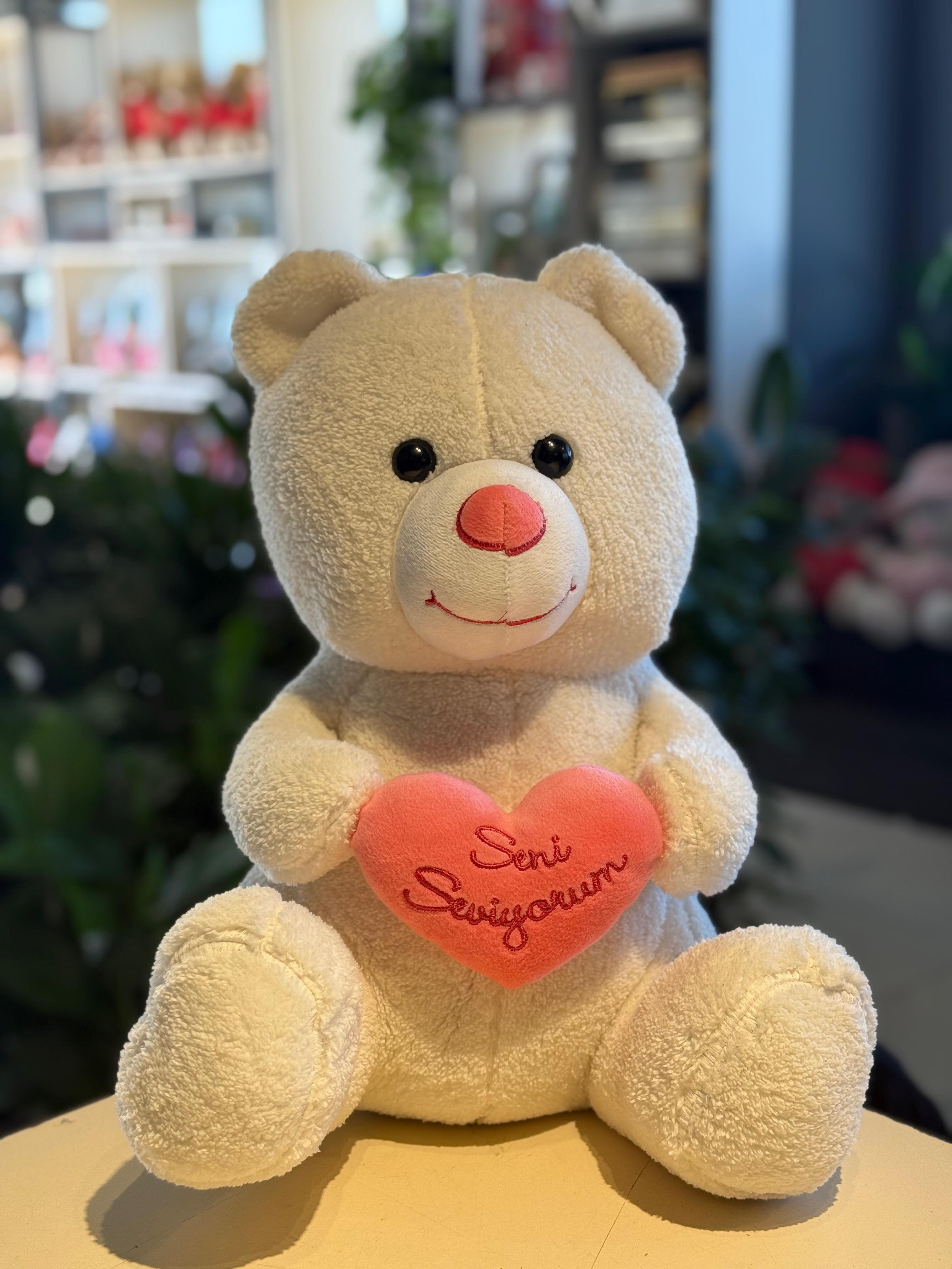Beyaz Pembe Kalp Tutan Peluş Ayıcık
