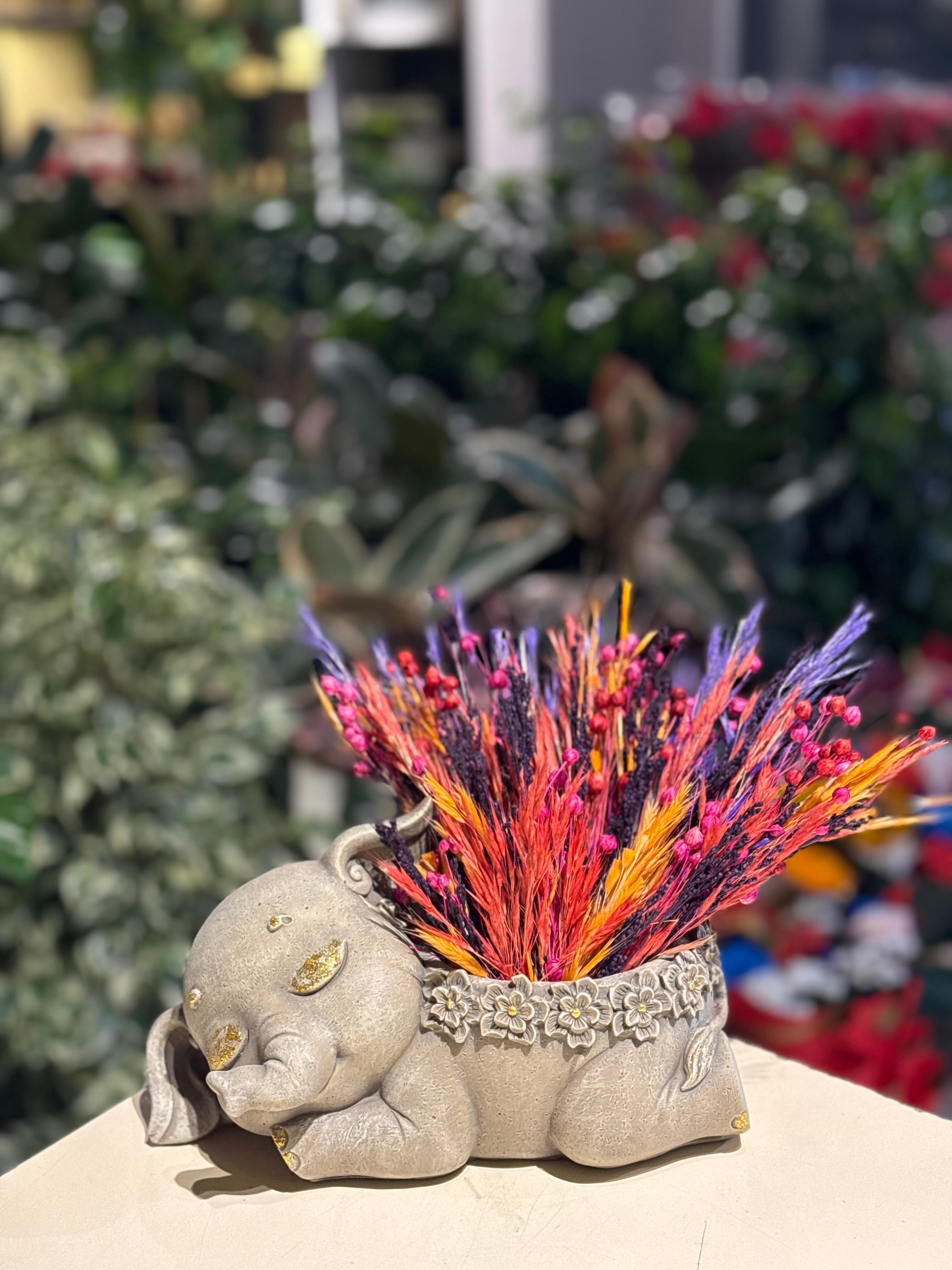 Eskitme Desenli Fil Seramik Kırmızı Mor Kuru Çiçek