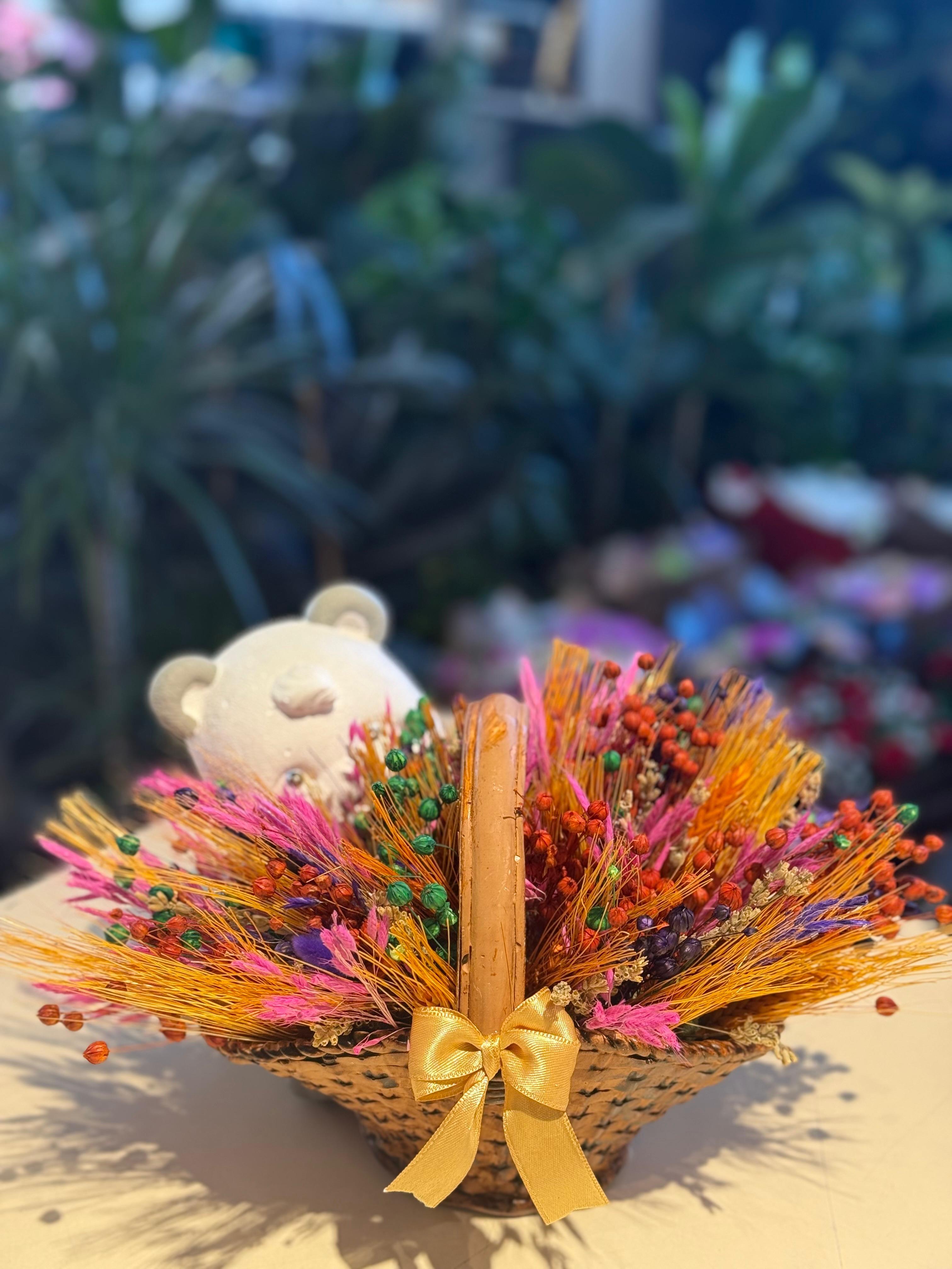 Kahverengi Sepetli Ayıcık Seramik Kuru Çiçek