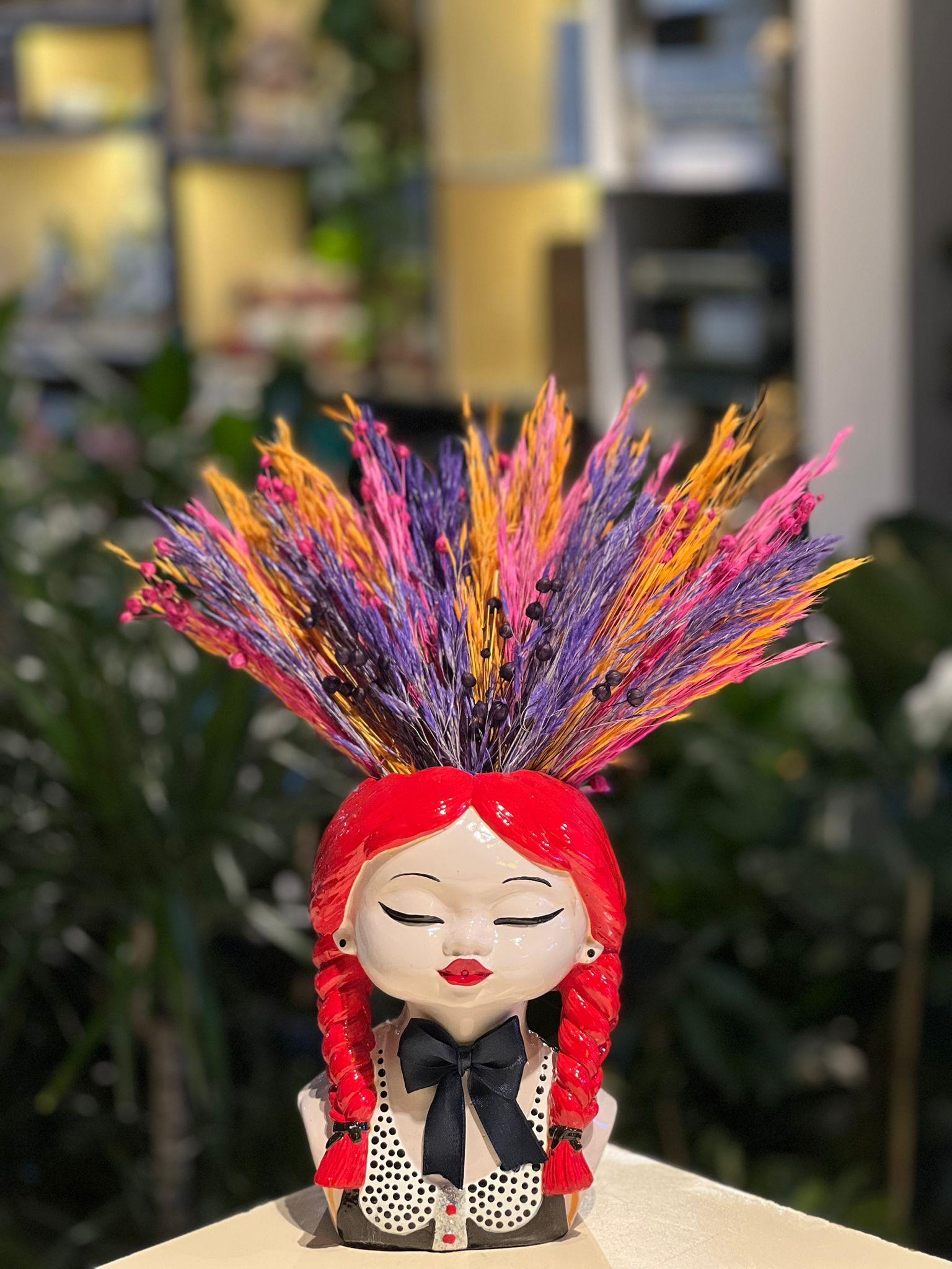 Kırmızı Saçı Örgülü Kız Seramik Kuru Çiçek