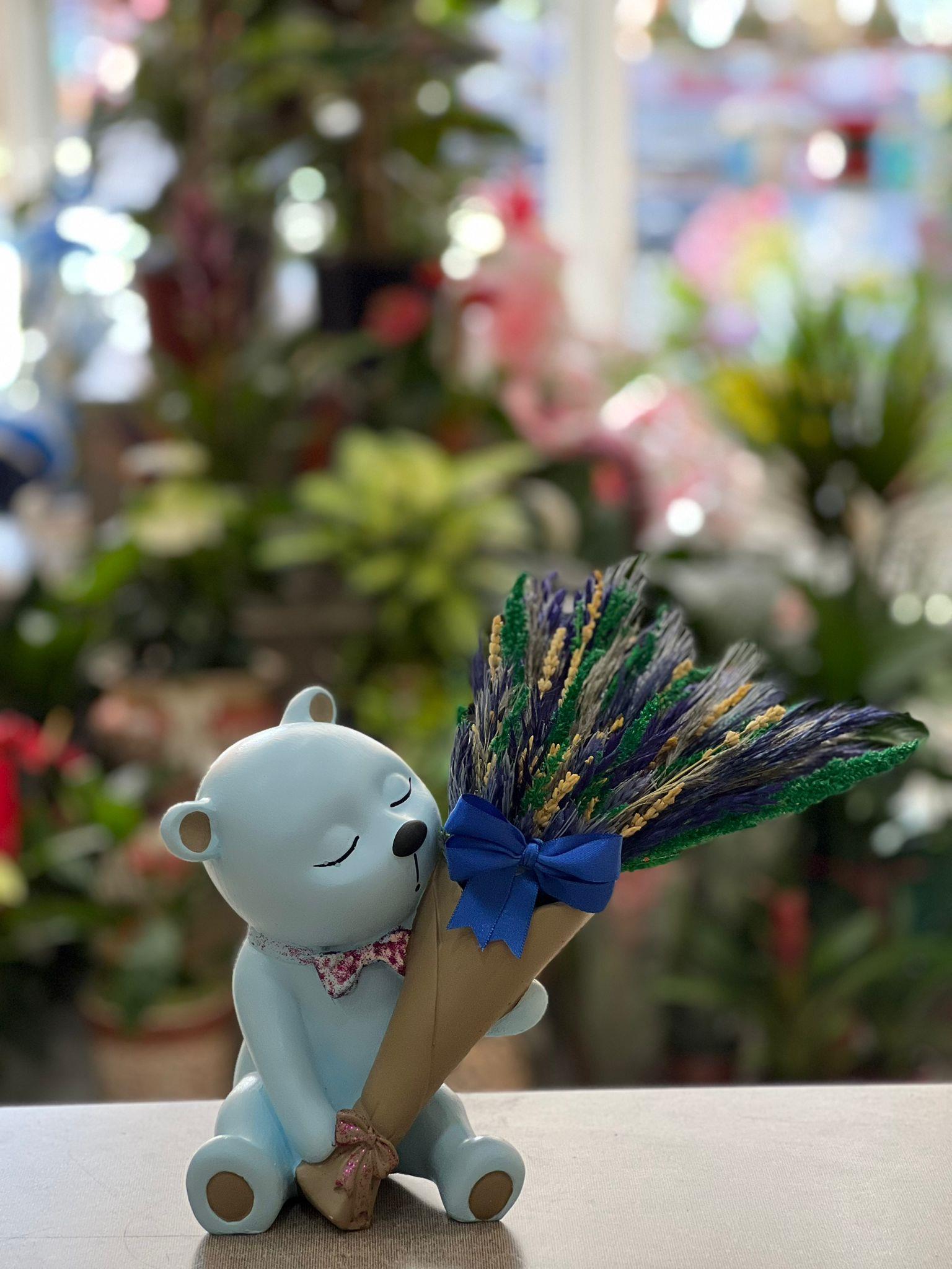 Mavi Panda Seramik Kuru Çiçek Mavi Kurdele Detaylı