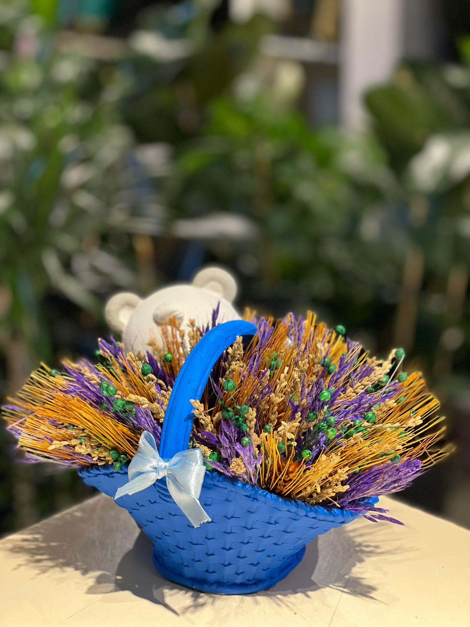Mavi Sepetli Ayıcık Seramik Kuru Çiçek