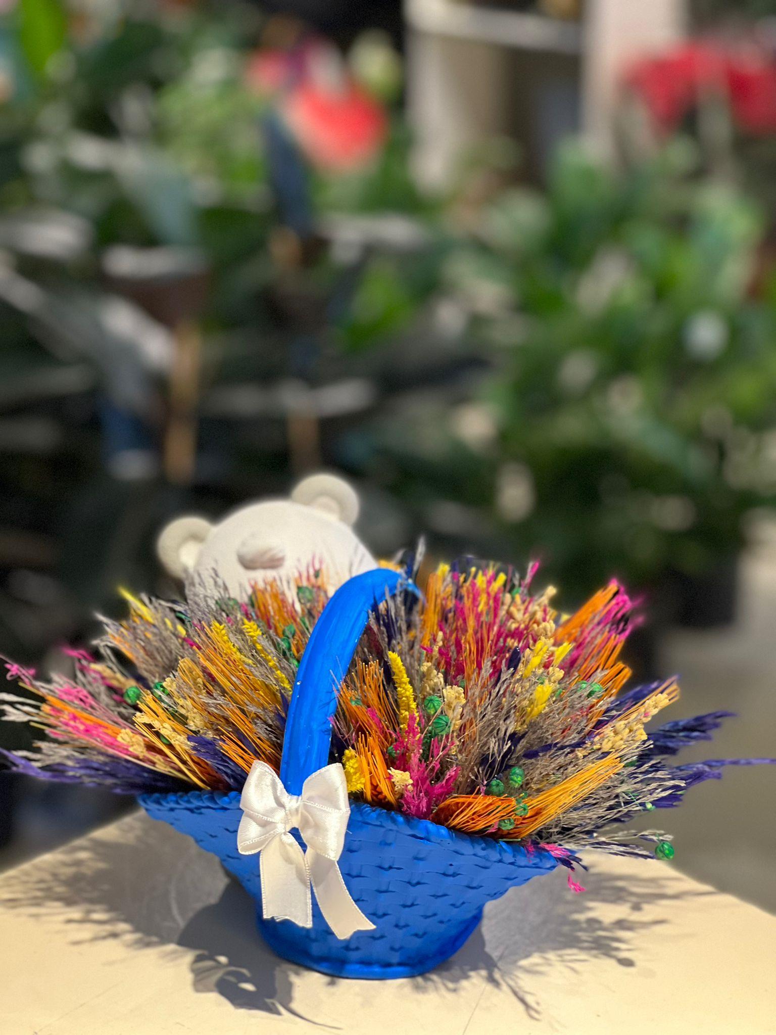 Mavi Sepetli Ayıcık Seramik Kuru Çiçek