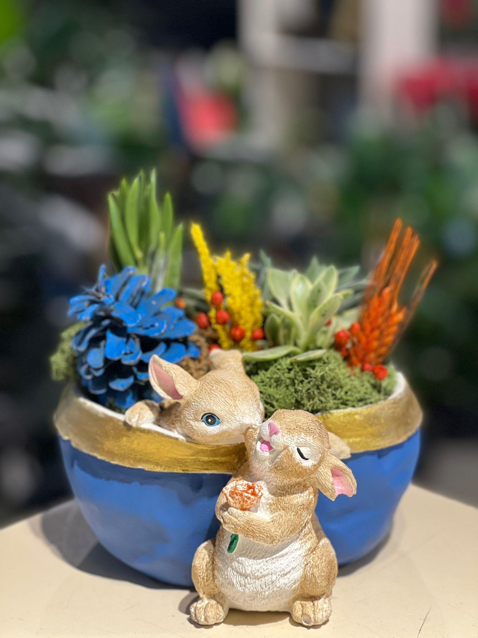Mavi Tavşan Seramik Sukulent Aranjmanı