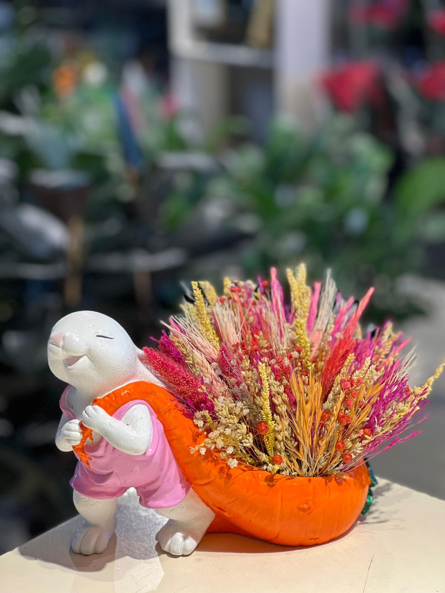 Pembe Elbiseli Tavşan Seramik Kuru Çiçek
