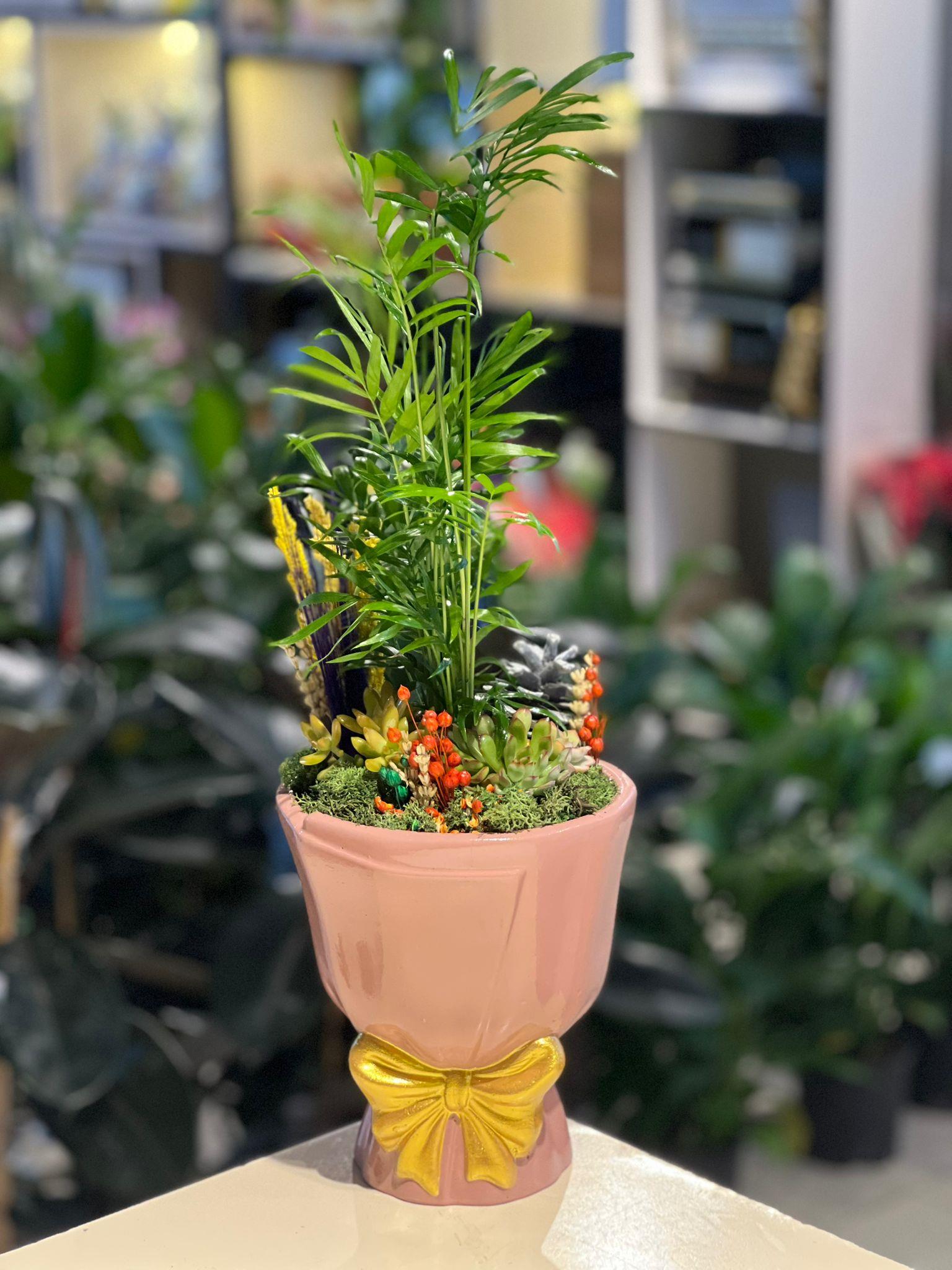 Pembe Kurdele Seramik Chamaedorea Sukulent