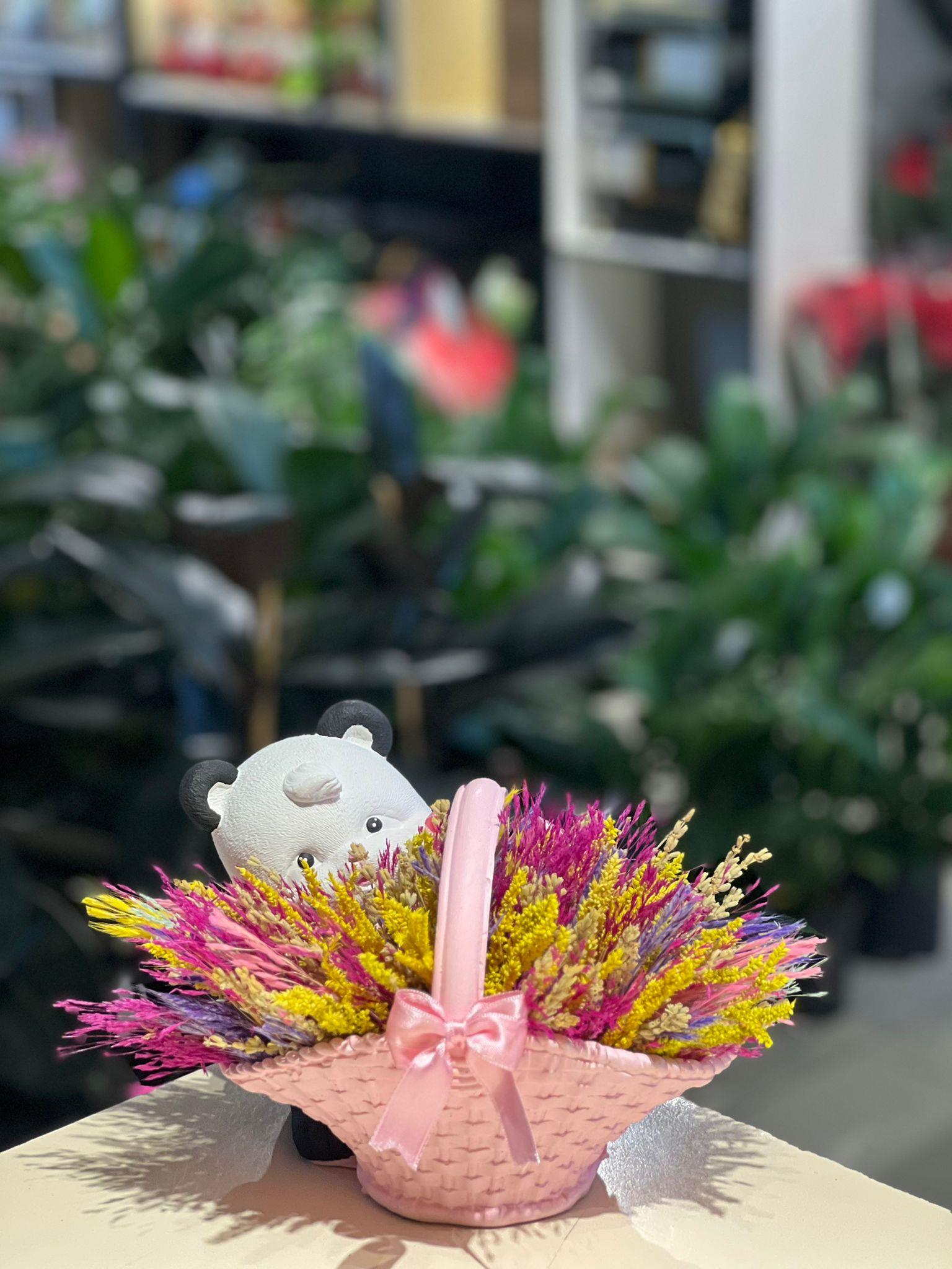 Pembe Sepetli Ayıcık Seramik Kuru Çiçek
