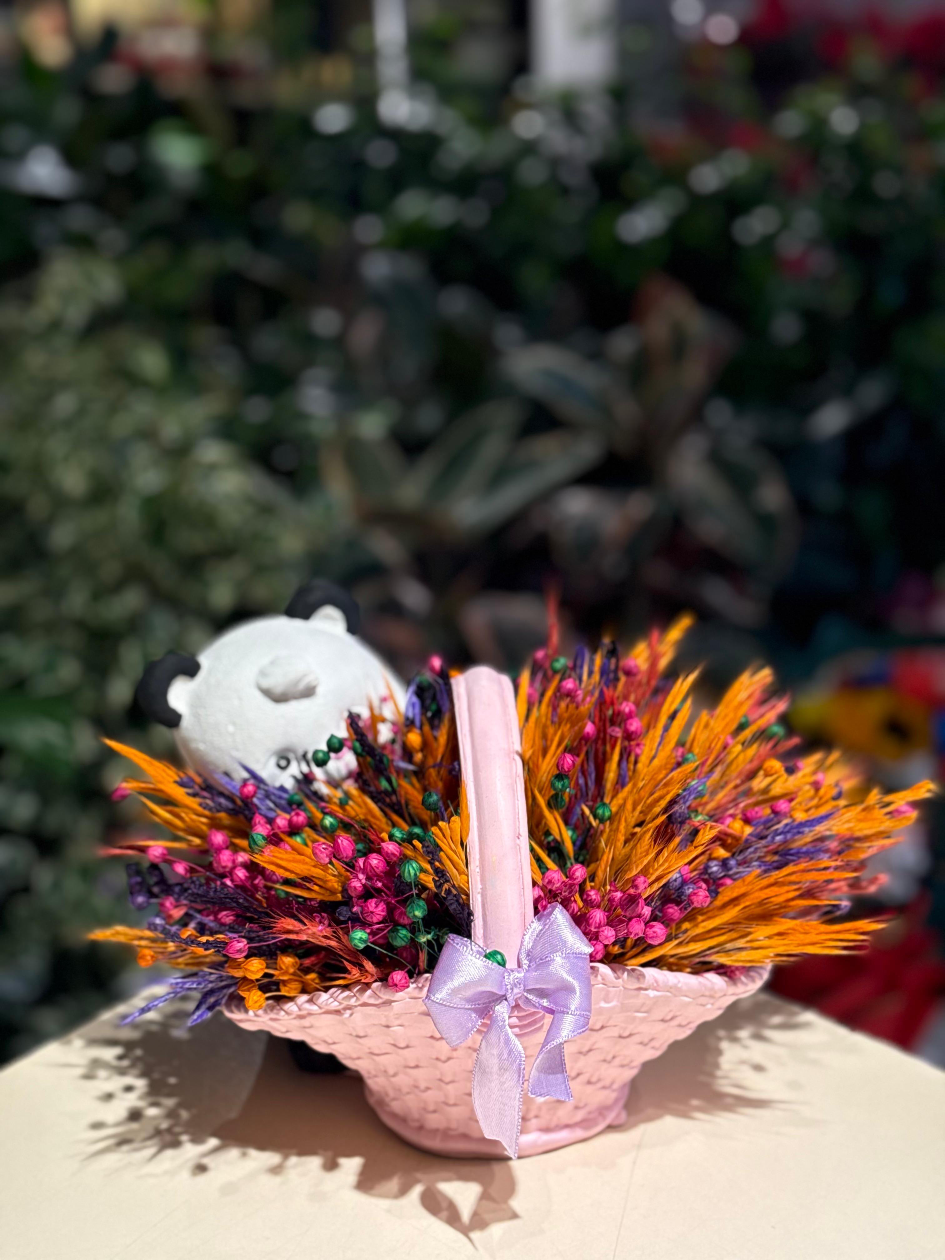 Pembe Sepetli Ayıcık Seramik Kuru Çiçek