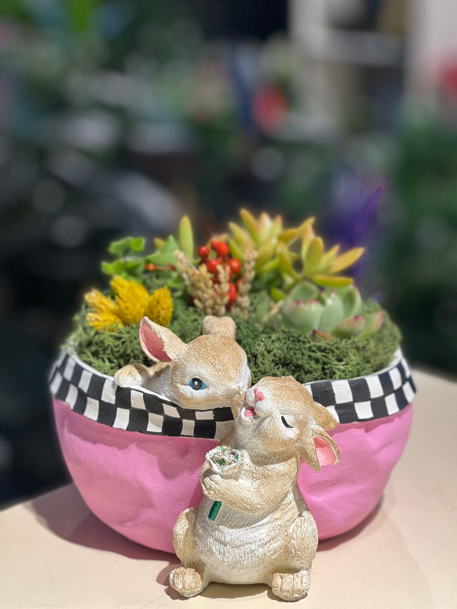 Pembe Tavşan Seramik Sukulent Aranjmanı