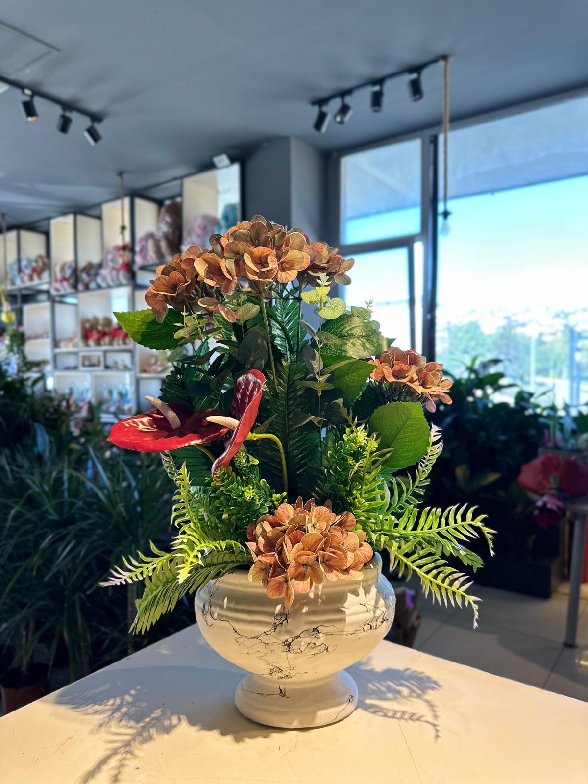 Seramik İçerisinde Yapay Ortanca Kırmızı Antoryum