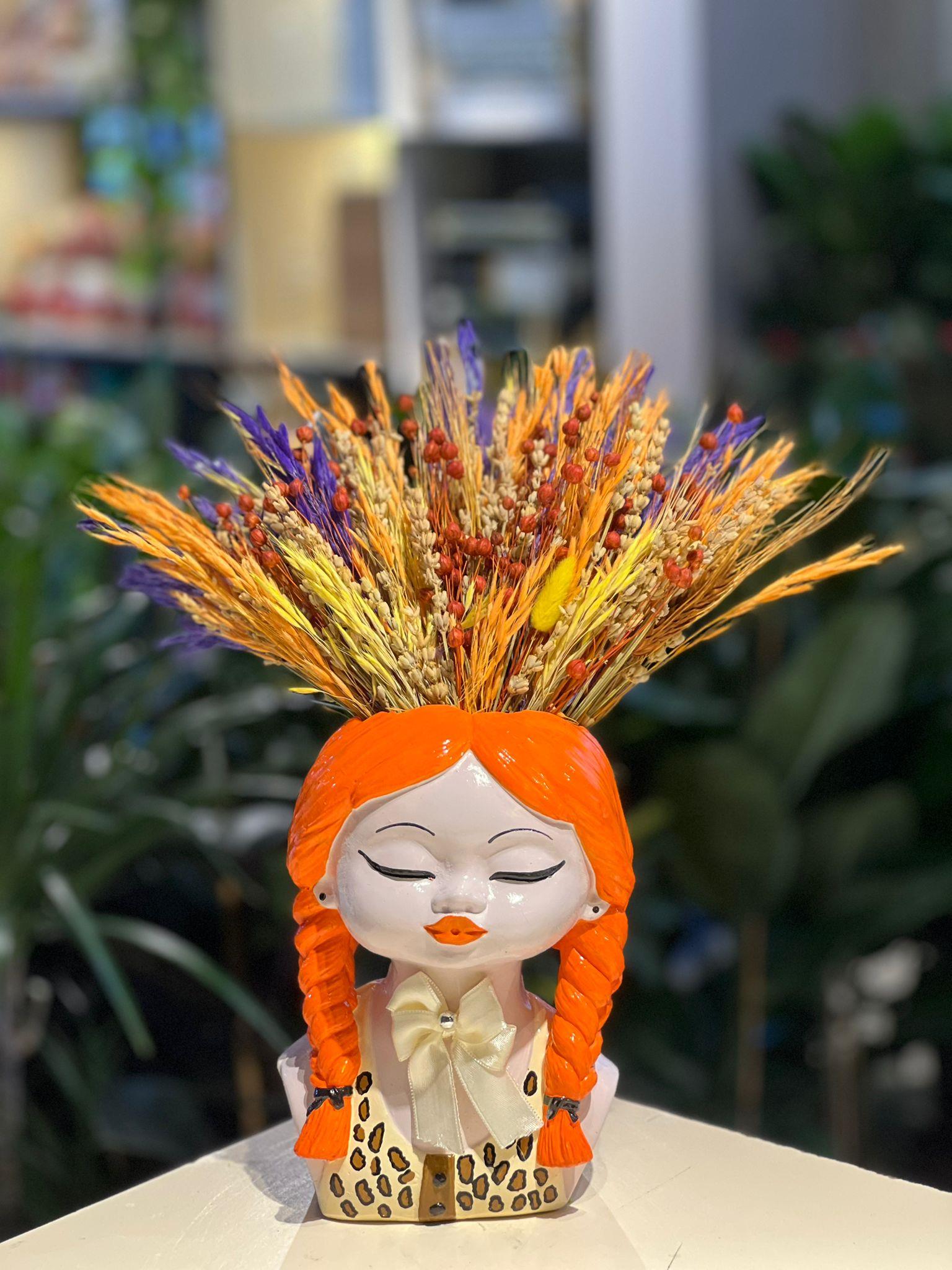 Turuncu Saçı Örgülü Kız Seramik Kuru Çiçek